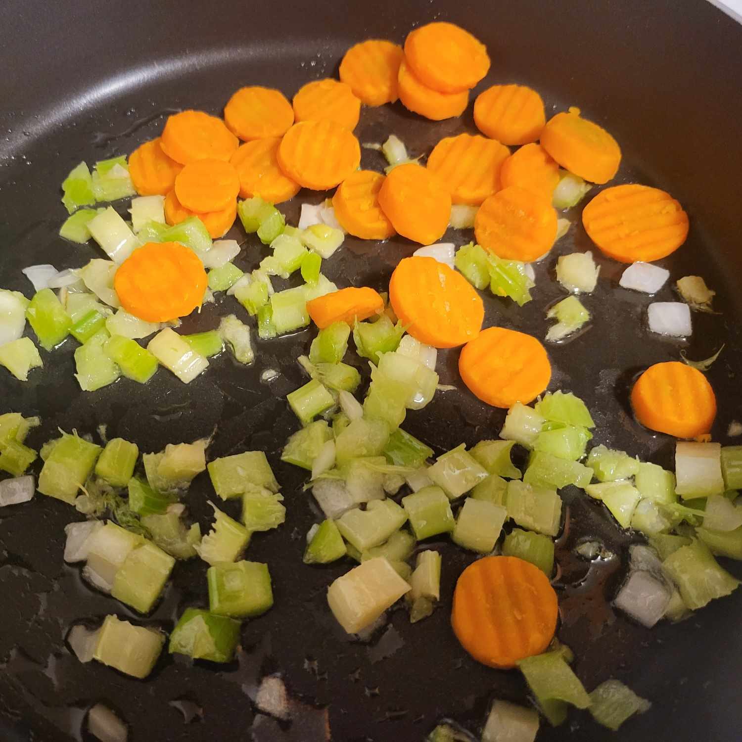 - In a large or deep medium pan on medium heat, add vegetable oil. onions, and celery. Cook until vegetables are tender and onions are translucent.2 tbps vegetable oil, 1 onion, diced, 2 celery stalks cut in 1.5-inch slices or diced