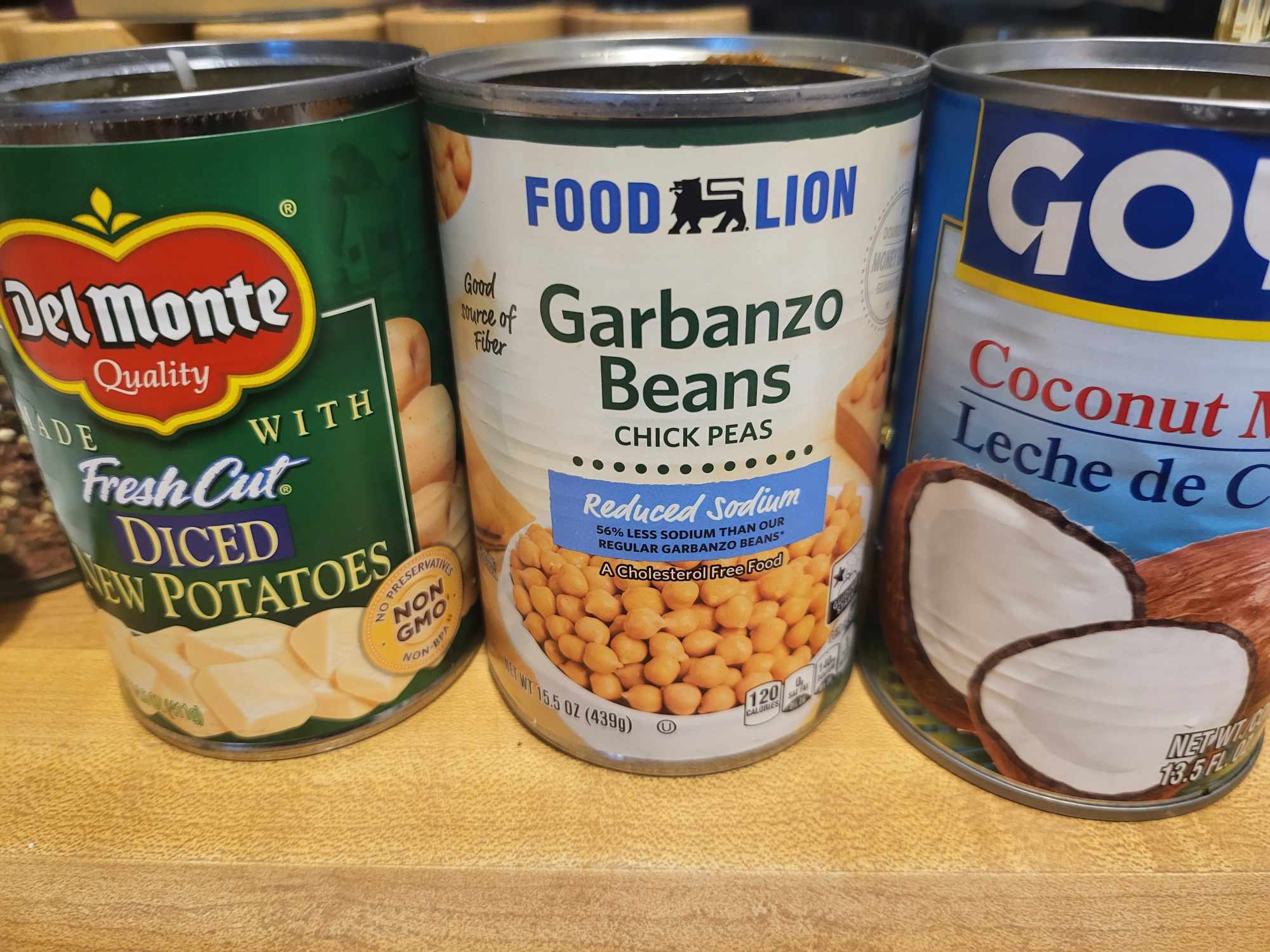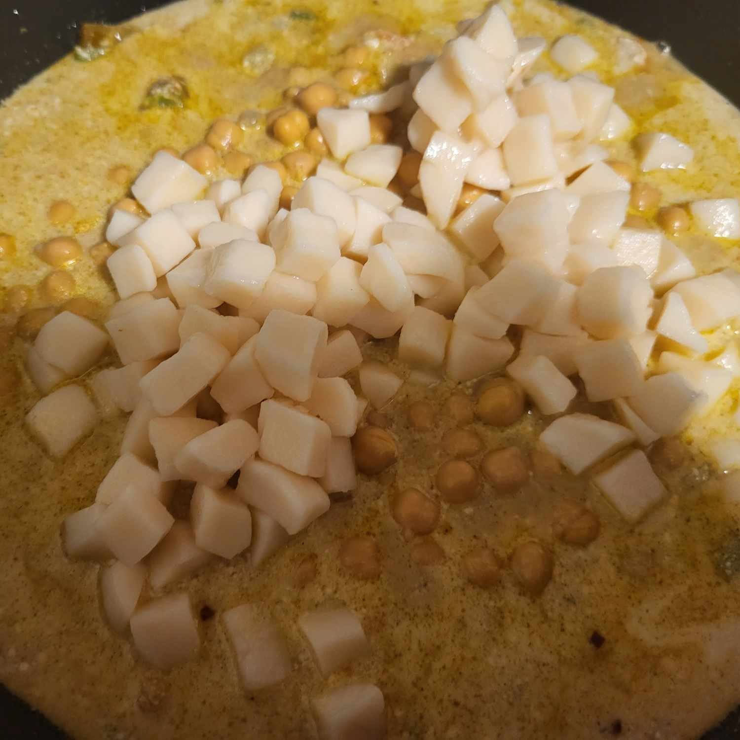 - Add coconut milk, 1 cup of water, chickpeas, and potatoes. Stir to combine the mixture.1 can Coconut Milk, 1 can Garbanzo Beans (Chickpeas), 1 cup water, 1 can diced potatoes, drained and rinsed