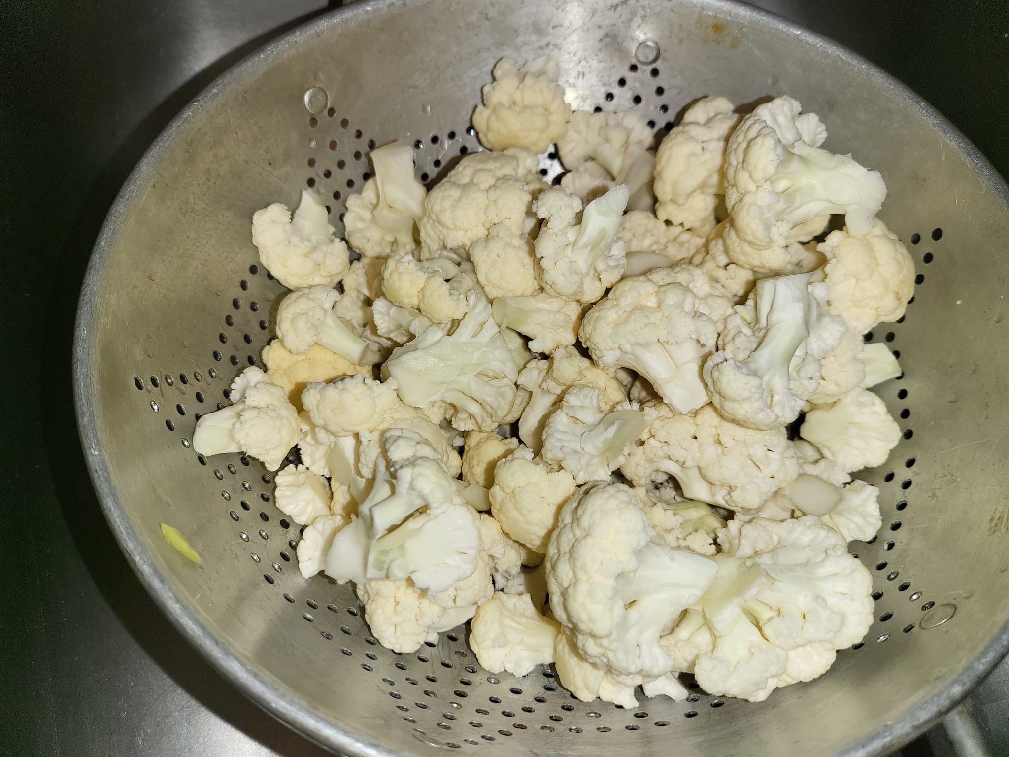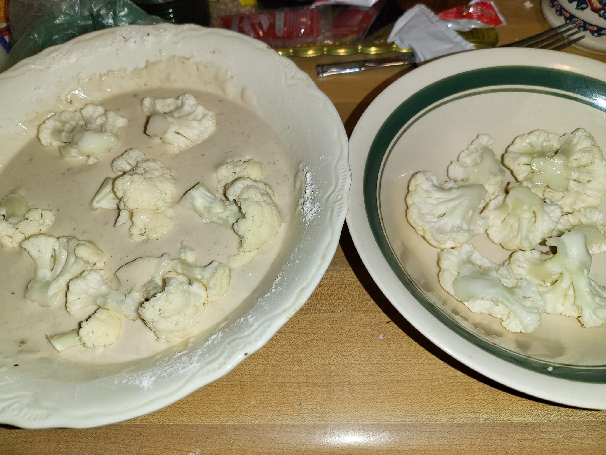 - Dip cauliflower pieces into the batter and coat evenly. Allow excess batter to drip off.1 head cauliflower
