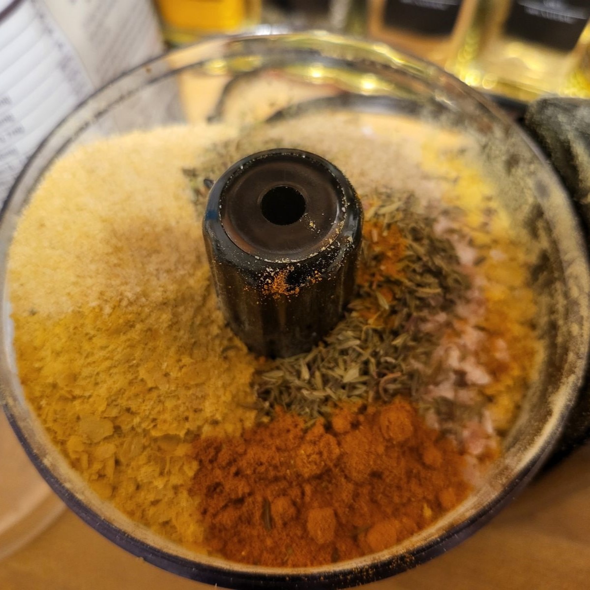 - Add all the ingredients to a small blender or food processor and pulse until everything is combined and powder-y.2 cups nutritional yeast, 1/4 cup Pink Himalayan Salt, 2 Tbsp onion powder, 1 Tbsp turmeric, 1 Tbsp Italian seasoning, 1 tsp celery salt, 1 tsp dried thyme